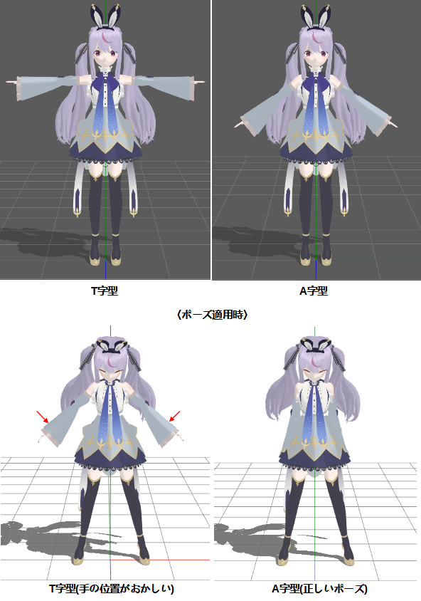 下の図がT字とA字の時に、同じポーズを適用した時の差になります。これが、モーション適用では、すべての動きで腕の位置(角度)に違和感ができてしまいます