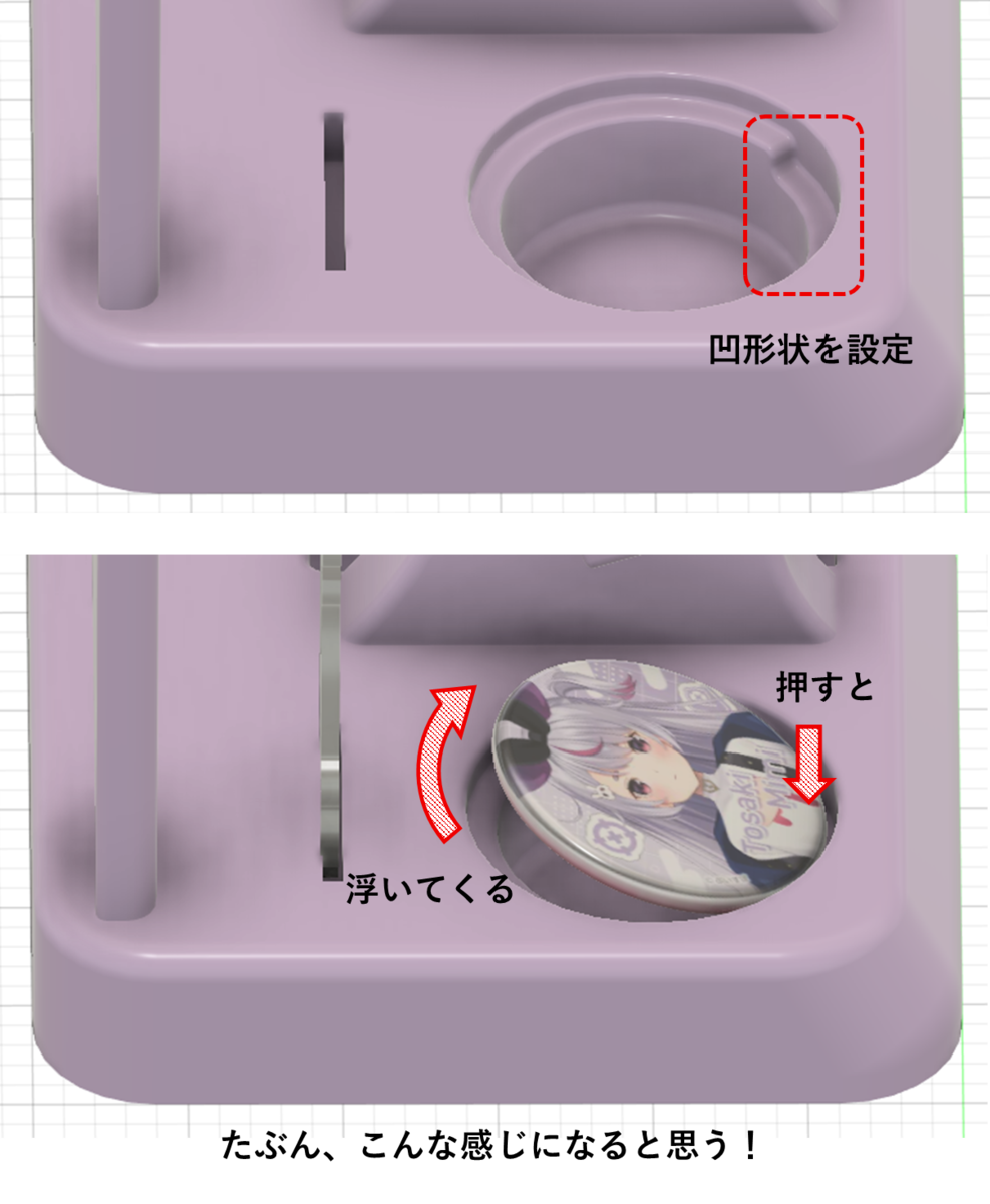 では最後に、缶バッチを凹み部分から外せる様にしようと思います。